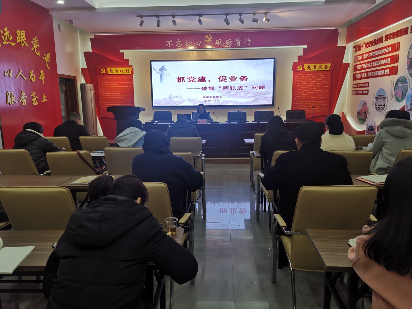 12月21日下午3点30分市博物馆召开党员(扩大)会议,市文广旅体局党组成员、副局长温军燕领学习近平总书记在中央全面依法治国工作会议上的重要讲话精神,并为市博物馆全体党员、在编干部职工上题为《抓党建,促业务——破解“两张皮”问题》的党课,提出,要把党建放在更重要的位置,通过加强党建,提振博物馆干部职工精气神,增强凝聚力,抓实抓牢党建工作为业务保驾护航。要加强学习,要学深悟透,结合工作实际,学到实处。观念理念要更新,在工作中要有大局意识,在文旅融合中,主动作为;要健全完善各项制度,用制度管人。