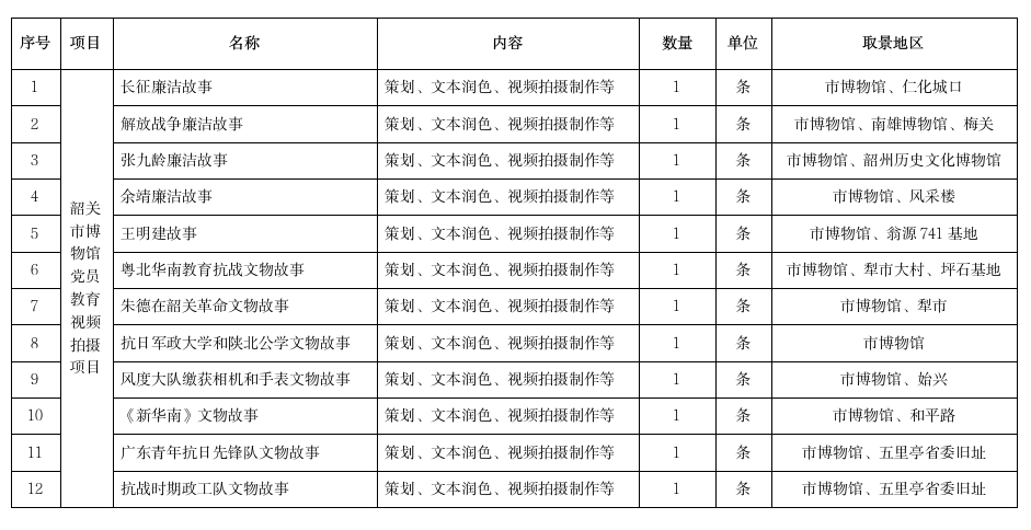 交付时间:2025年10月31日前交付全部视频(9月30日前需完成长征、解放战争、张九龄廉洁故事视频);拍摄服务范围:韶关市(曲江区、浈江区、乐昌市、南雄市、仁化县、始兴县、翁源县、韶关市博物馆、北伐战争纪念馆、中共广东省委粤北省委机关旧址等地);交付地点:广东省韶关市武江区工业西路90号韶关市博物馆。