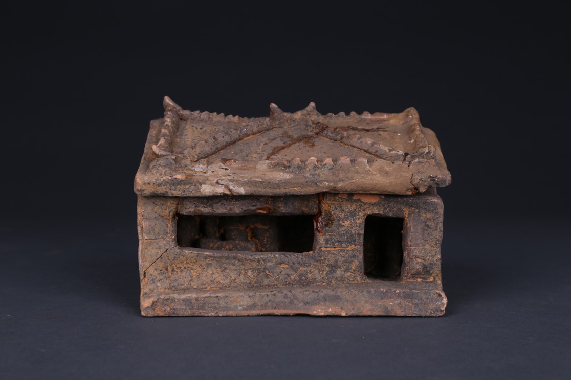 硬山顶陶屋;屋顶可揭开,硬山顶陶屋,屋顶正脊有”正吻“类饰物,两端有“鸱尾”类饰物,垂脊、斜脊作锯齿形;前部开一门洞和横形窗洞,屋内右侧有二俑,持杵相对舂,左边有一俑捧筛作筛米状,筛内有三粒谷。