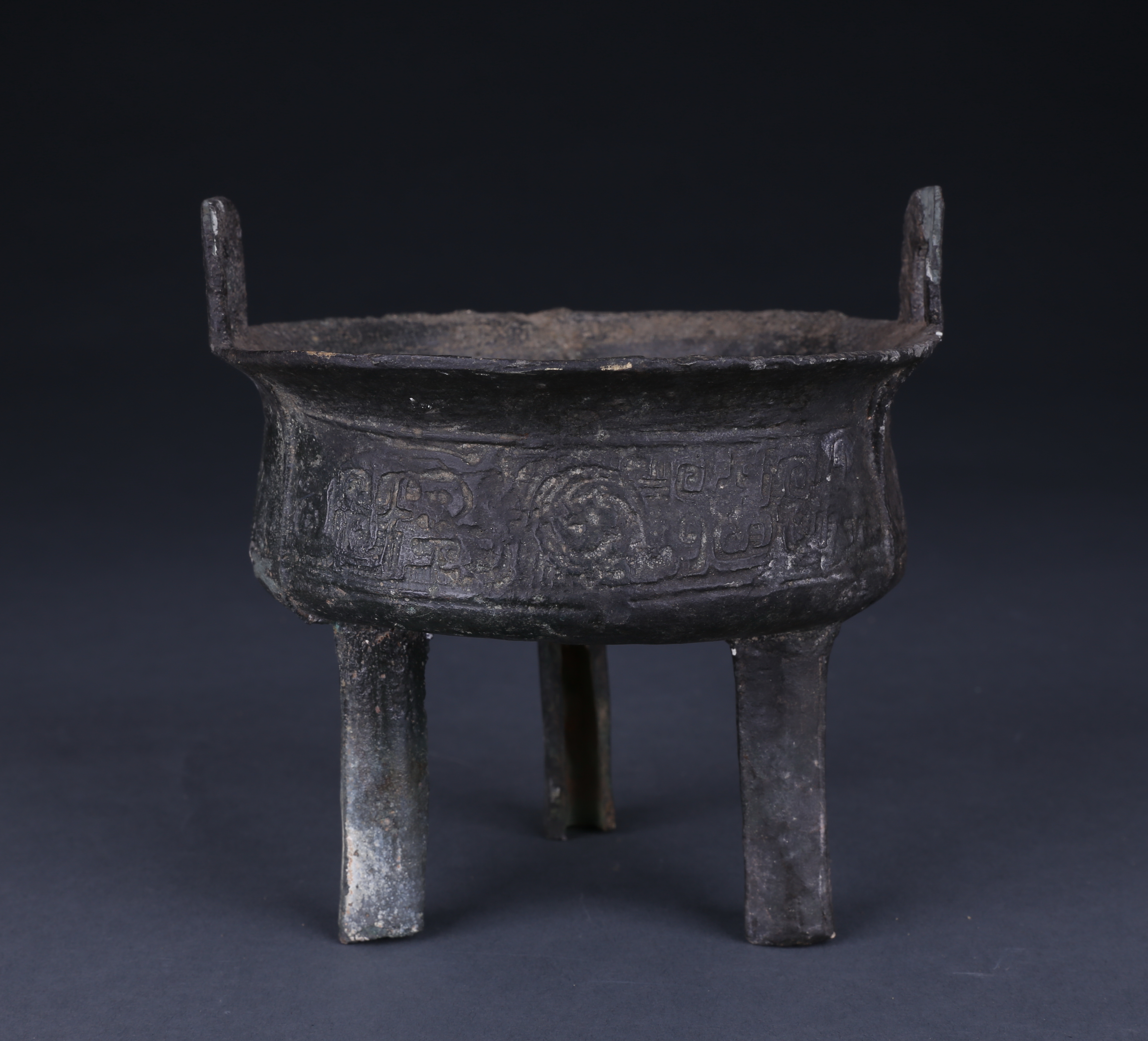 此鼎撇口,有二立耳,大平底,三中空柱足。鼎身饰夔龙纹。