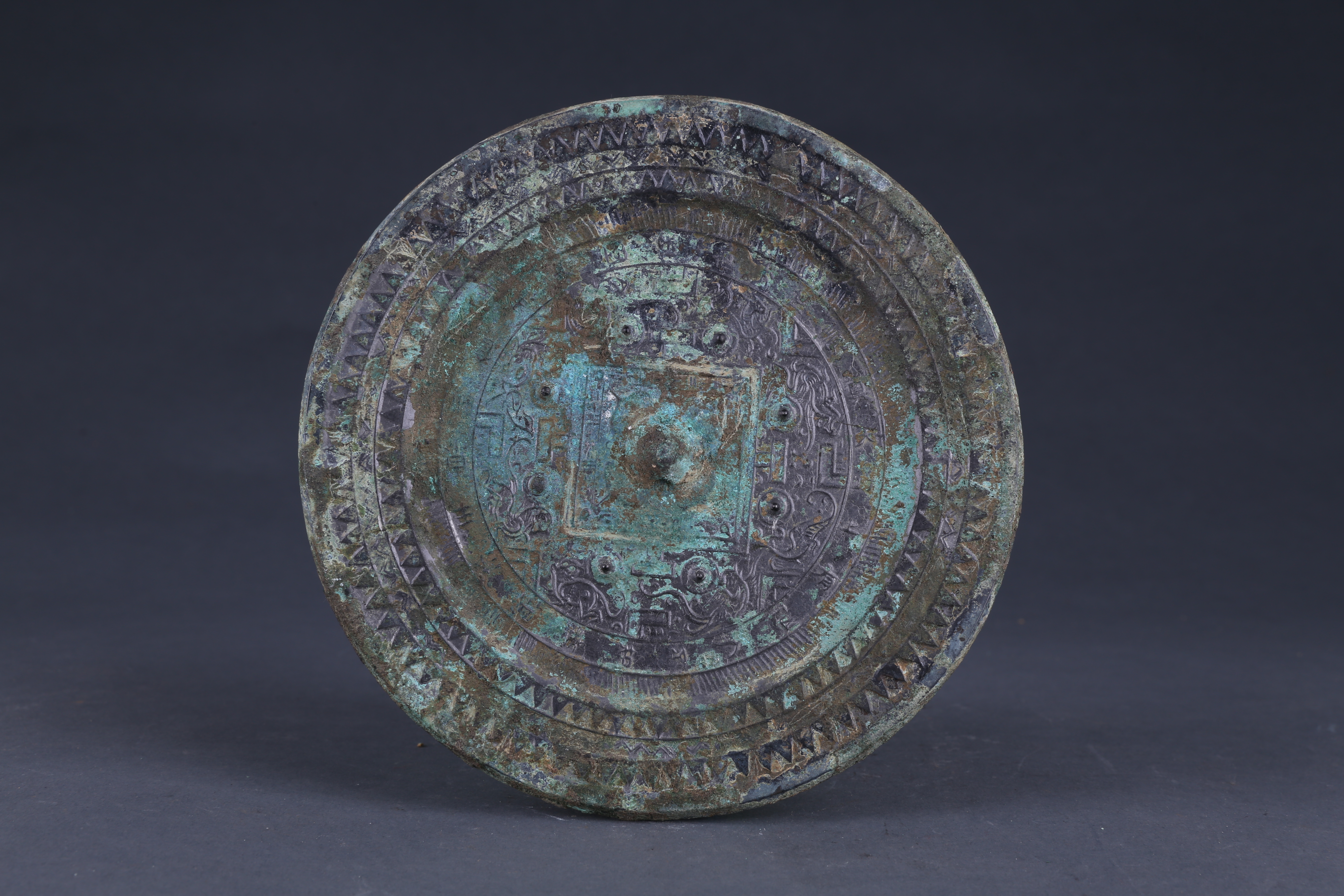 圆形,半球形圆钮,柿蒂纹钮座,钮座外围的方框内饰八卦纹。内区为规矩纹及瑞鸟、神兽等装饰,以八个乳丁间隔。铭带有“尚方作镜真大好,上有仙人不知老,渴饮玉泉饥食枣,□国保”铭文,外缘饰锯齿纹。