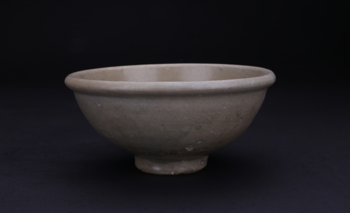 通高7.4,口径15.3,底径5.5厘米。 韶关市博物馆藏 圆唇外翻,弧腹,圈足。胎体厚重,器身施青釉,底不施釉。