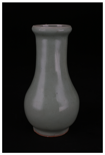 通高16厘米,口径5.2厘米,底径5.5厘米。韶关市博物馆藏。敛口,长束颈,鼓腹,圈足。通体施粉青釉。