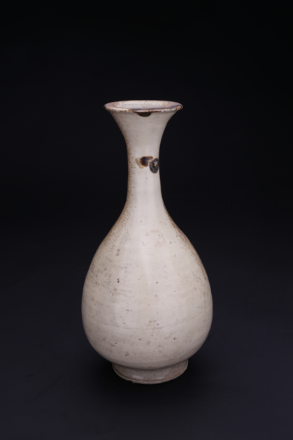 通高29,口径7.8,底径8.5厘米。 韶关市博物馆藏 撇口,细长颈,溜肩,鼓腹,圈足微外撇。口沿、颈部有酱彩斑纹,腹部有一圈凹弦纹。施白釉,底不施釉。